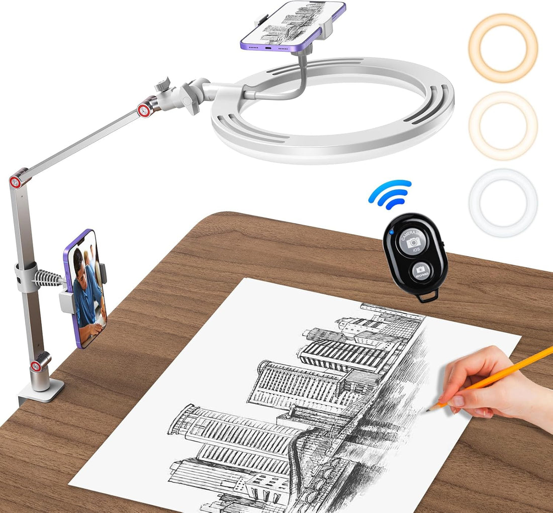 MicroEye Ring Light with Stand and Phone Holder, USB 10'' Ring Light for Desk with Remote Shutter, Overhead Phone Mount with Adjustable Arm and C-Clamp for Live Streaming/Photography/Makeup/TikTok