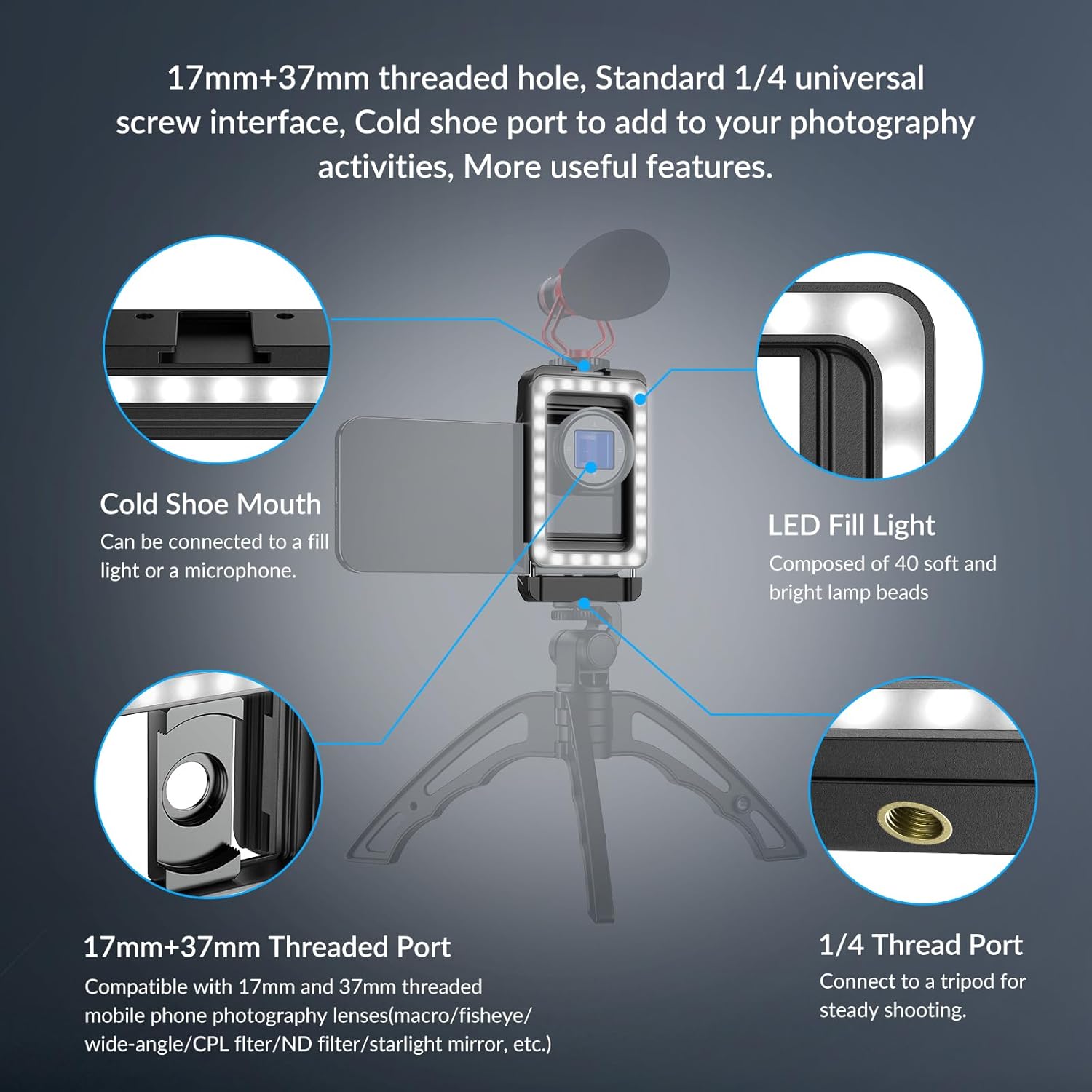 MicroEye 17mm+37mm Thread Lens Adapter with LED Fill Light, One-Piece Lens Phone Adapter for Android/iPhone, Lens Attachments for Macro/Wide Angle/Fisheye/Flow/Radial/Star Filter/Kaleidoscope Lens