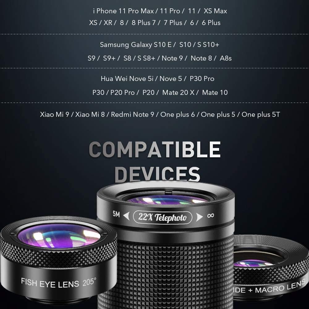 MicroEye 6 in 1 Phone Lens Kit - 22X Telephoto Lens, 205° Fisheye Lens, 120° Wide Angle Lens & 25X Macro Lens(Screwed Together), Compatible with iPhone 11 8 7 6 6s Plus X Xs/Max XR Samsung Black