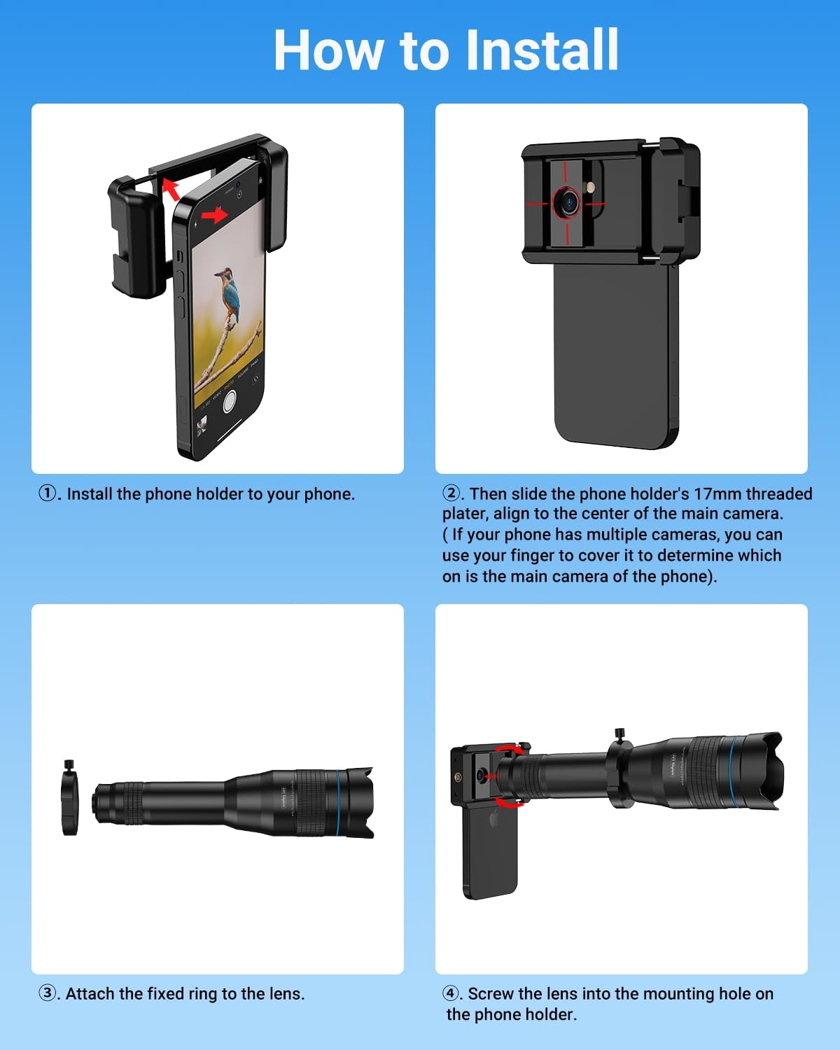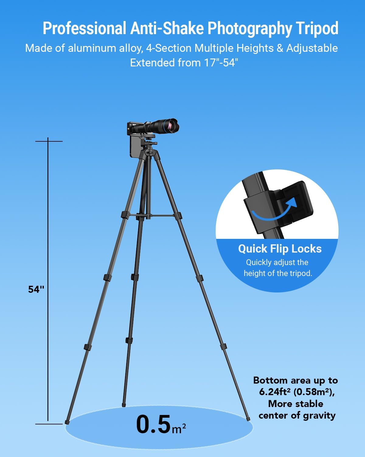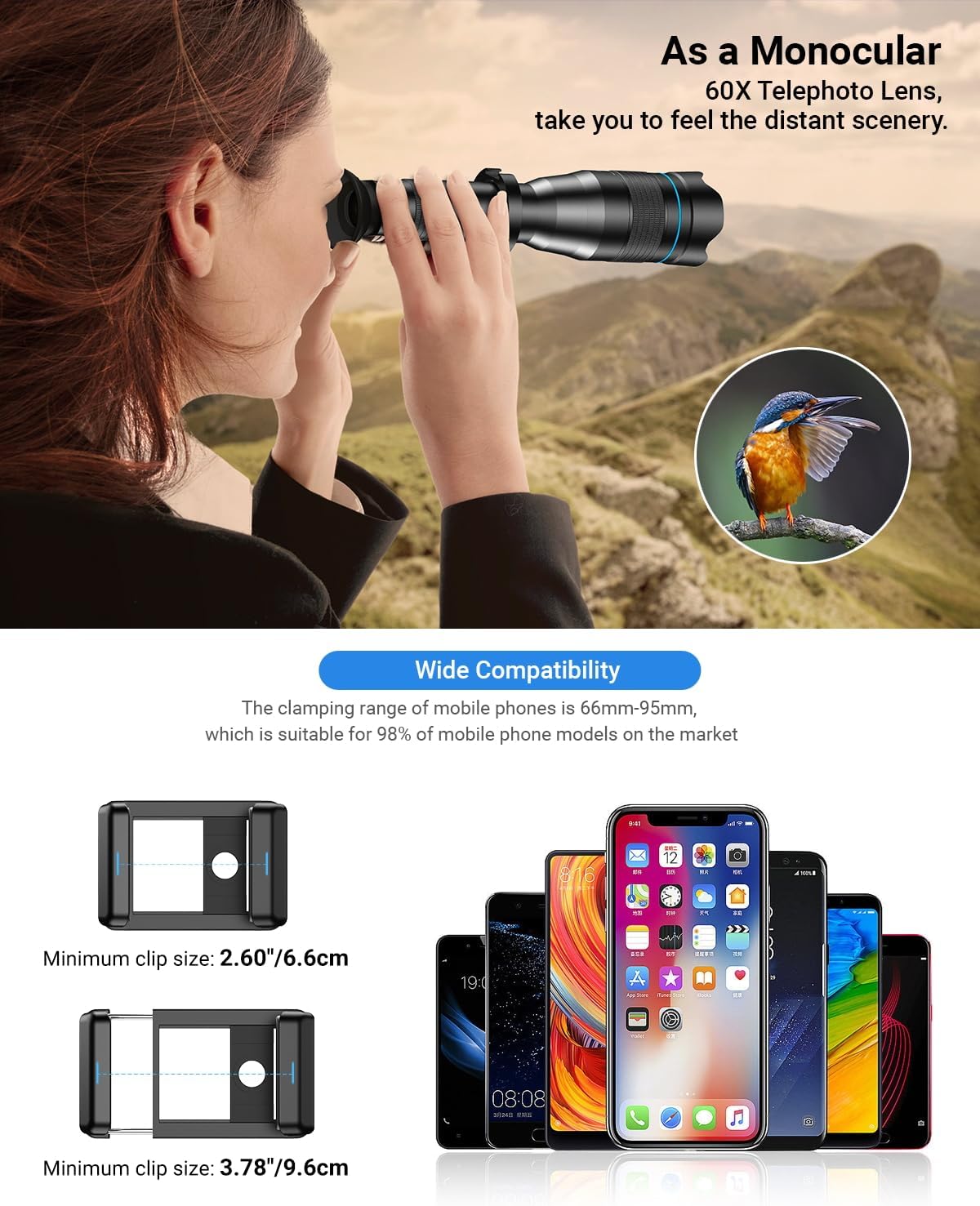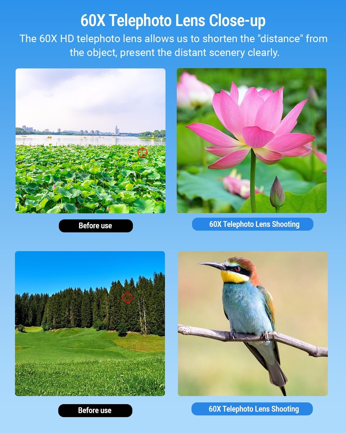 MicroEye High Power 60X HD Telephoto Lens, High Power Telephoto Mobile Cell Phone Lens with Extension Tripod and Wireless Remote for iPhone 15 Pro/14 Pro/13 Pro, Samsung and Most Smartphone.