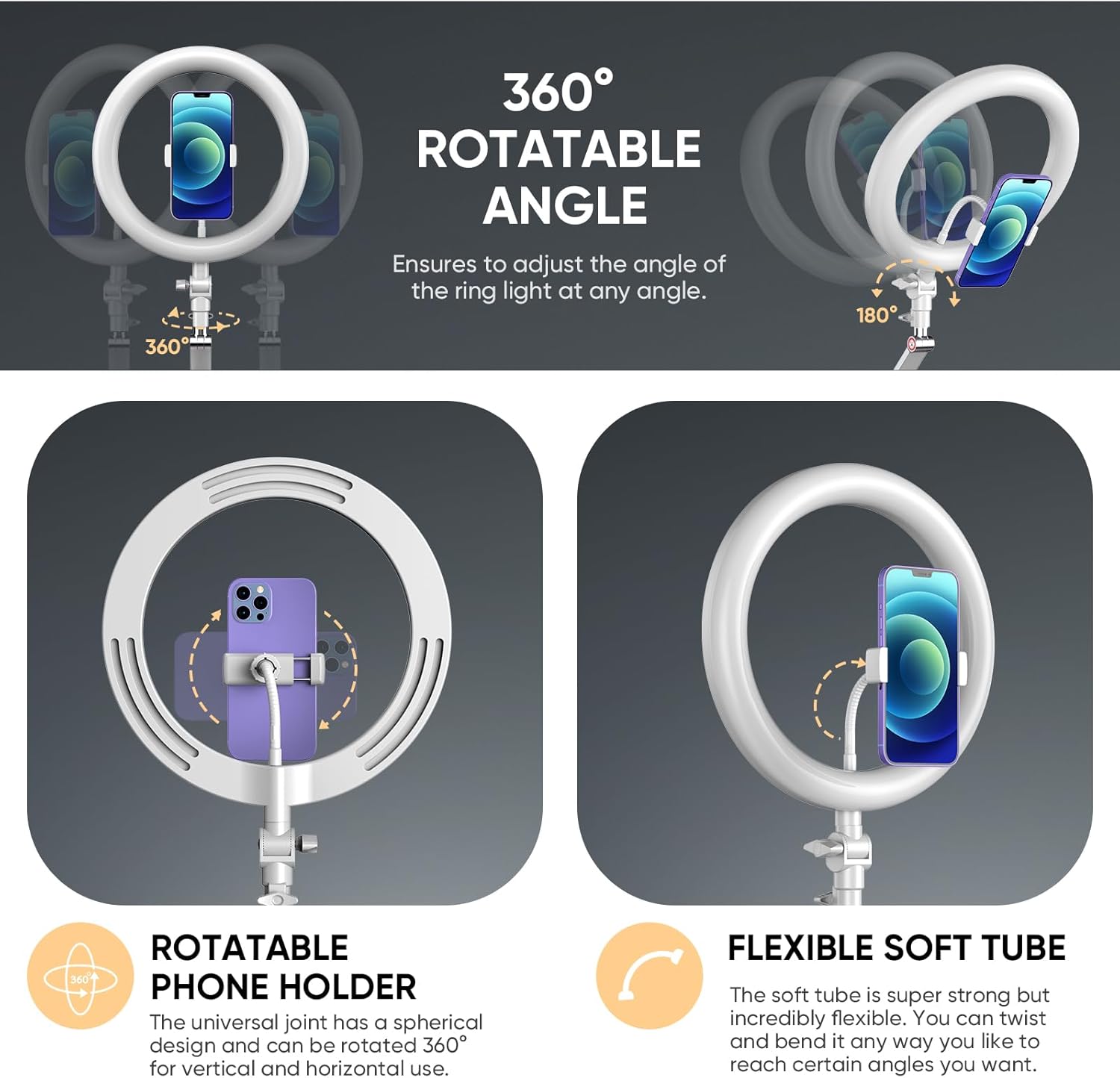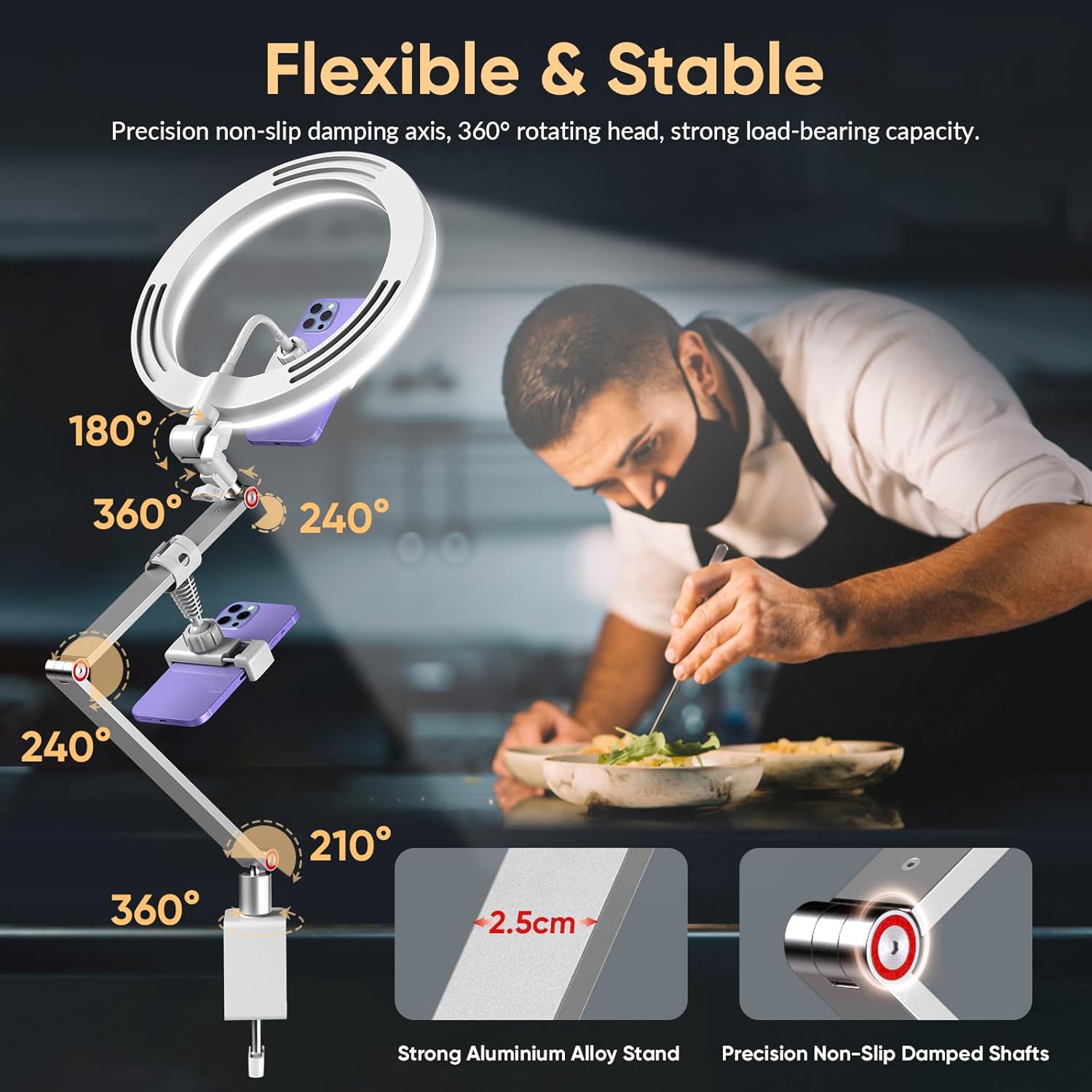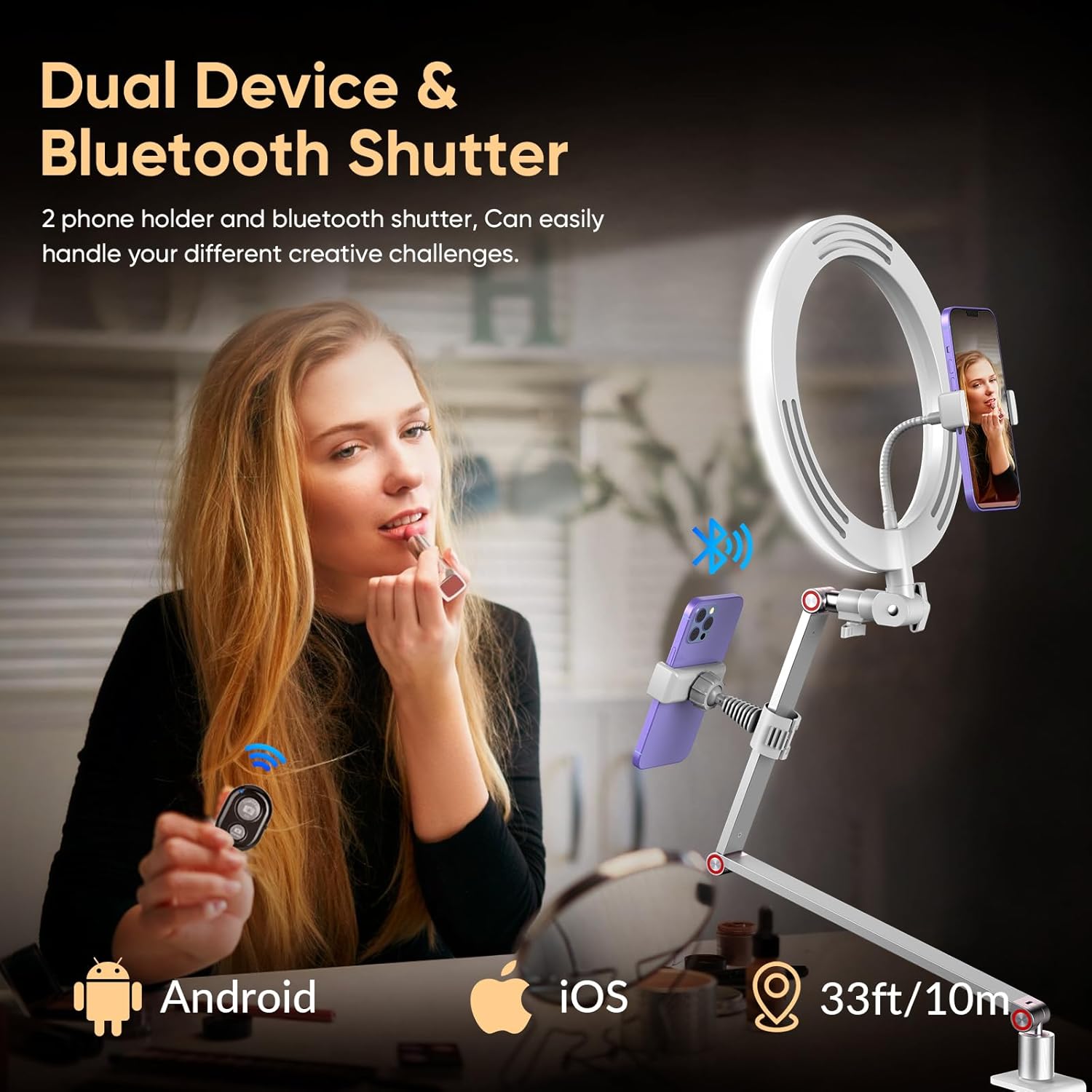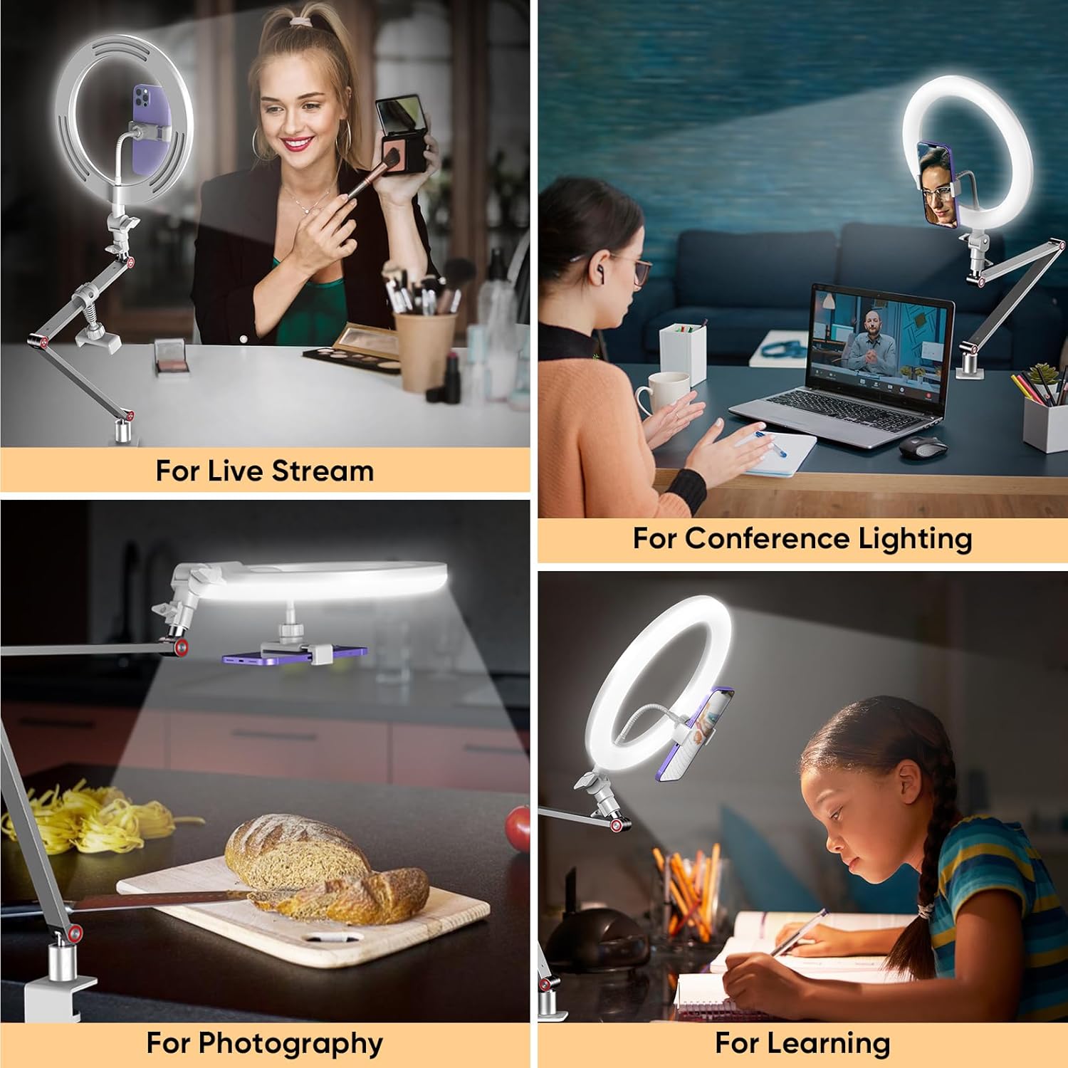 MicroEye Ring Light with Stand and Phone Holder, USB 10'' Ring Light for Desk with Remote Shutter, Overhead Phone Mount with Adjustable Arm and C-Clamp for Live Streaming/Photography/Makeup/TikTok