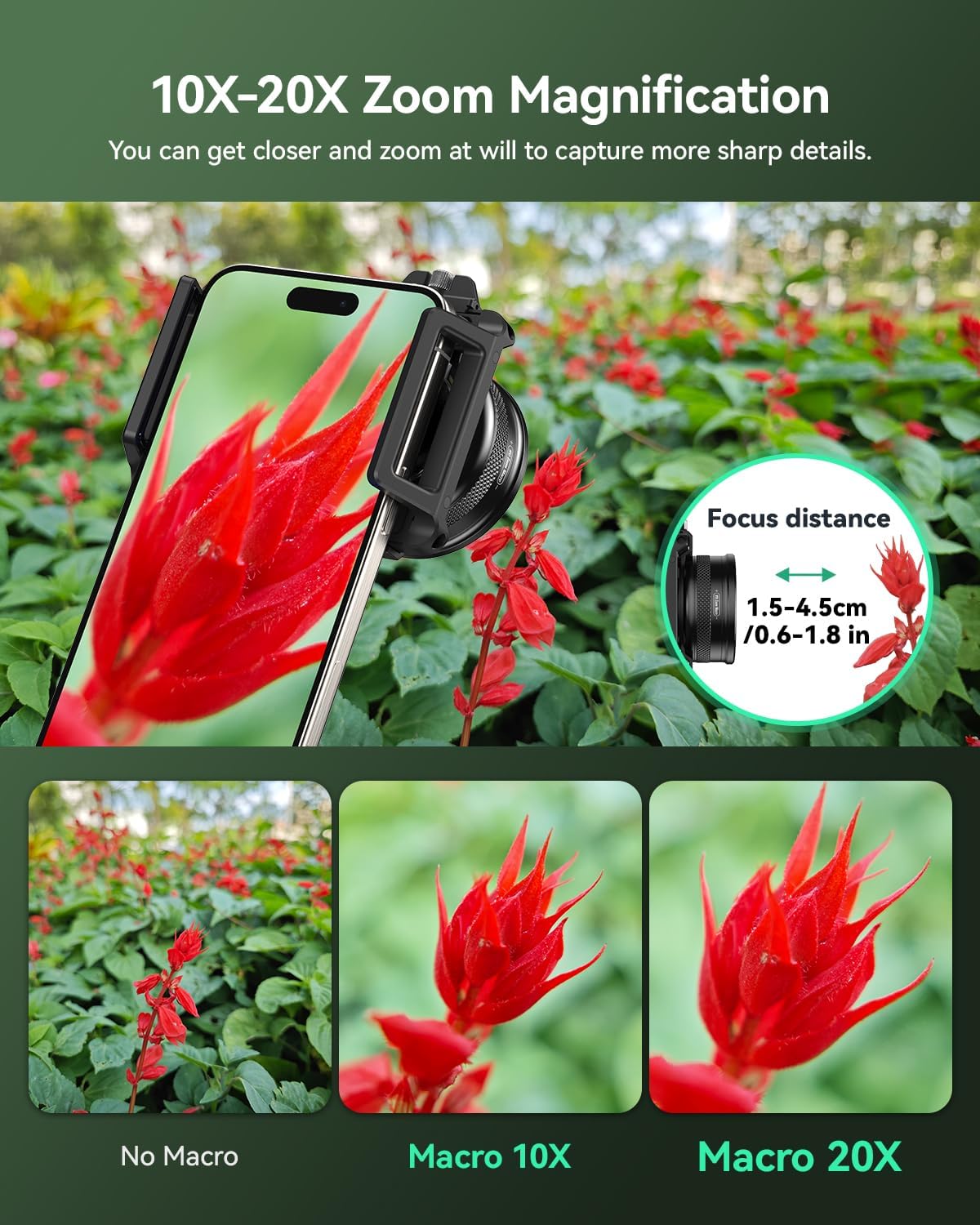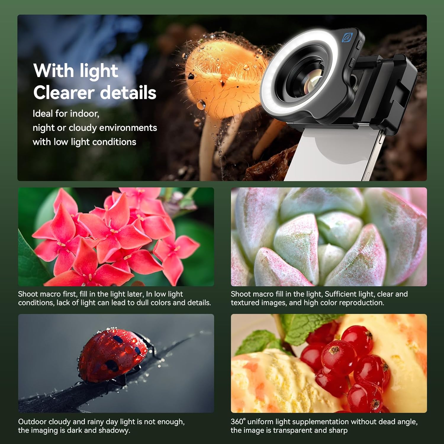 MicroEye Zoom Macro HD Photography Lens Kit, 10-20X Macro Lens for iPhone Android Phone with Universal Clip and Fill Light, High Power 32 LED/CRI 95+/45 Light Modes (Compatible with Almost All Phone)