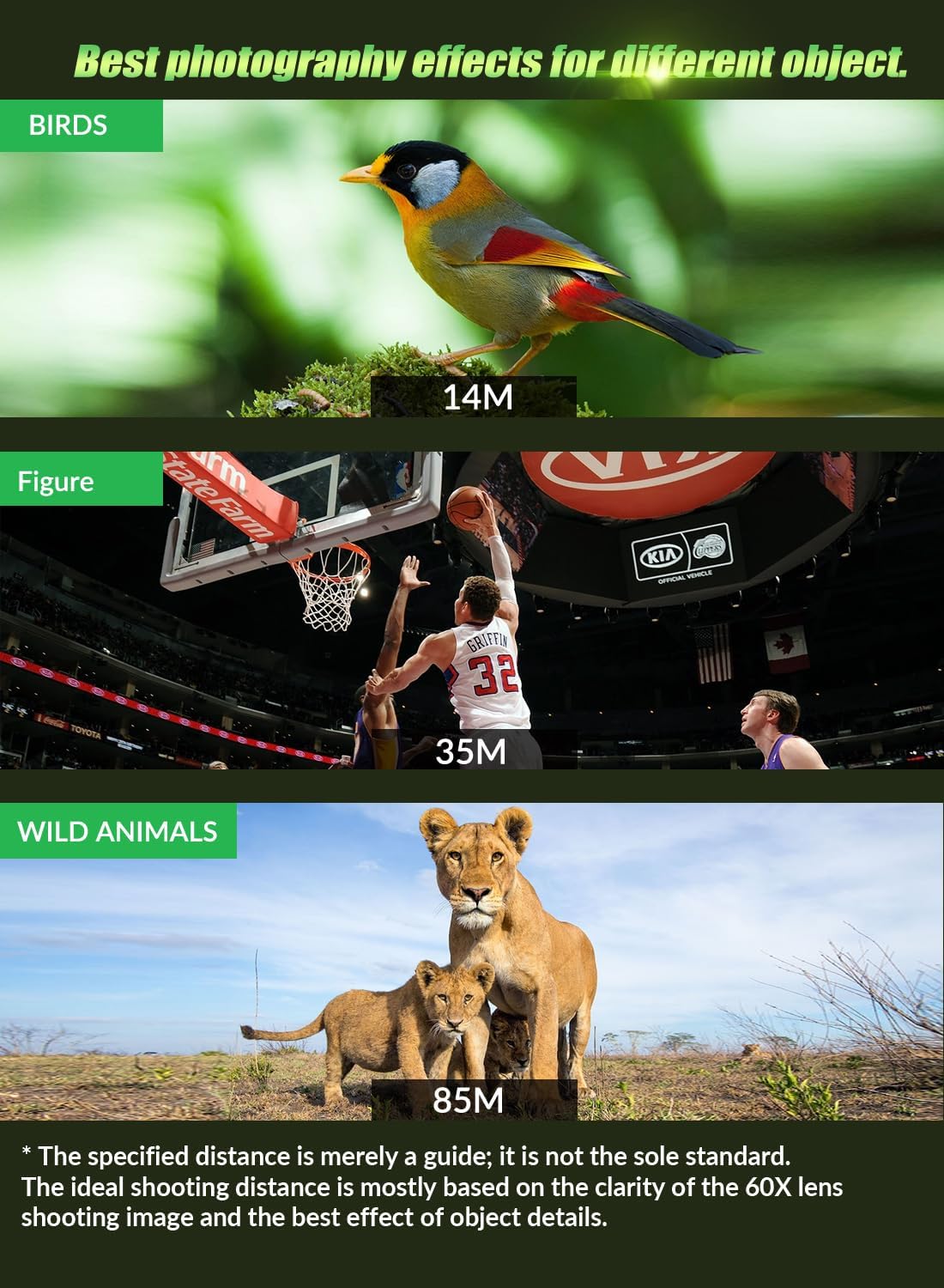 MicroEye High Power 60X HD Telephoto Lens, High Power Telephoto Phone Lens with Extension Tripod and Wireless Remote & 0.45X Wide Angle Lens 140°+ 12.5X Macro Len