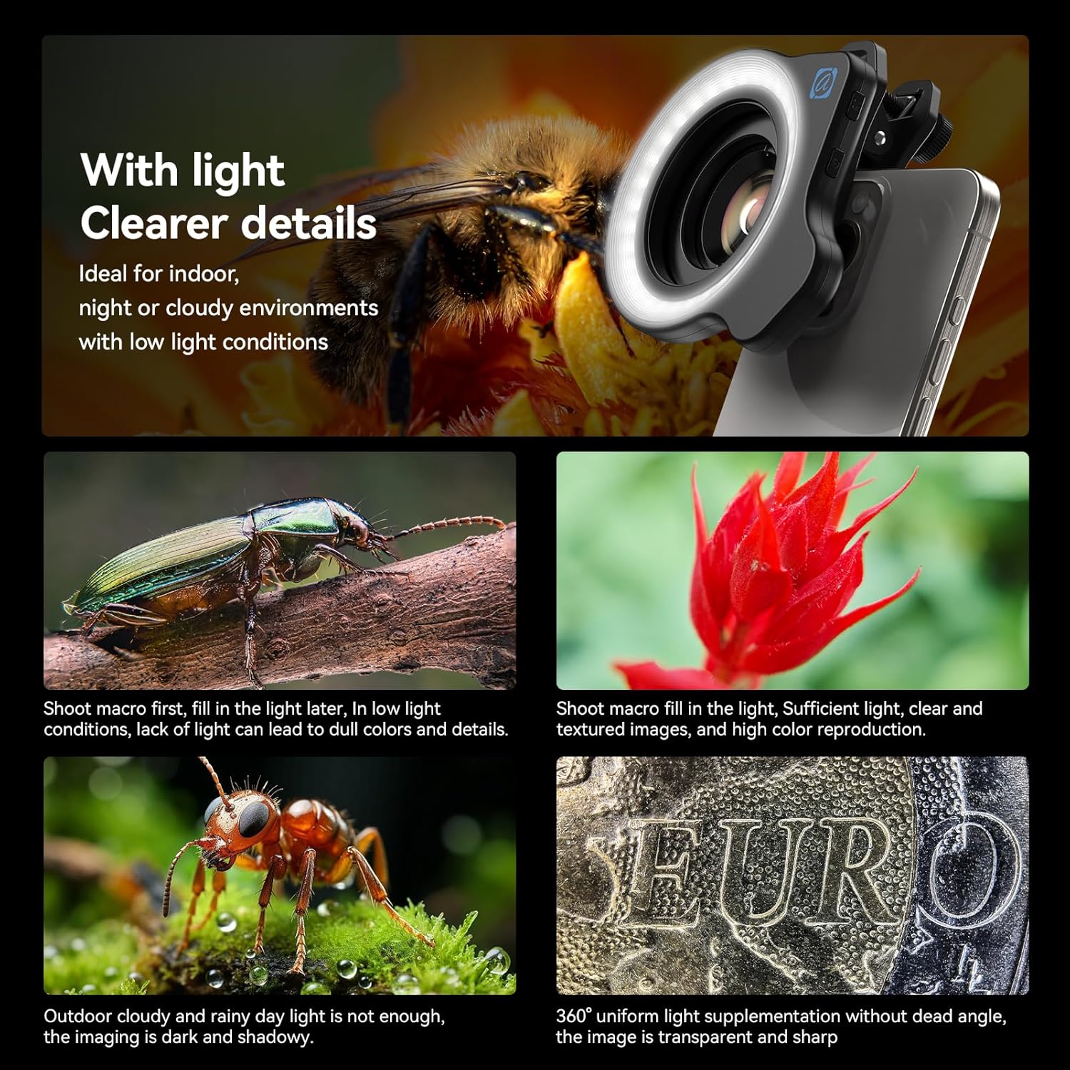 MicroEye Macro Lens with 52mm Fill Light 32 LED/CRI 95+/45 Light Modes for Dual Lens/Single Lens iPhone,Pixel,Samsung Galaxy Smartphones
